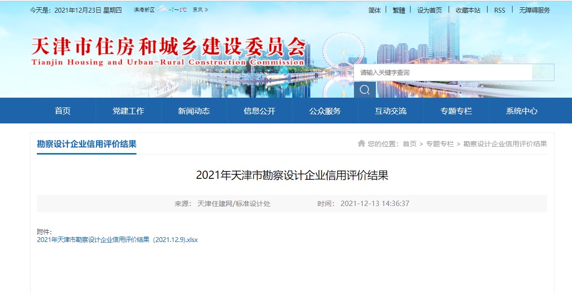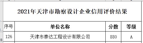 日前,天津市住房和城鄉建設委員會公布2021年度天津市勘察設計企業信用評價成果情況,泰達設計企業信用等級被評定為最高級A級。