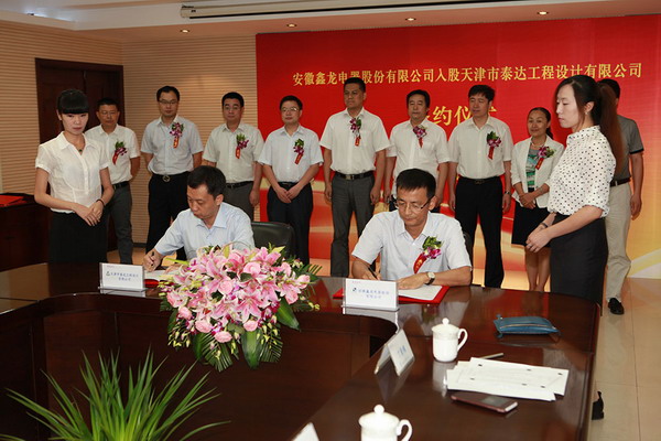 2014年7月8日上午9:30分,安徽鑫龍電器股份有限公司入股天津市泰達工程設計有限公司簽約儀式成功舉行,這標志著泰達設計公司迎來了新的發展機遇,鑫龍電器將與濱海電力、泰達設計共同攜手、共創未來。與會領導表達了對泰達設計公司未來發展的美好愿望和良好信心,我們相信,有各位領導的大力支持、有全體員工的共同努力,泰達設計公司必將健康發展、走向輝煌!